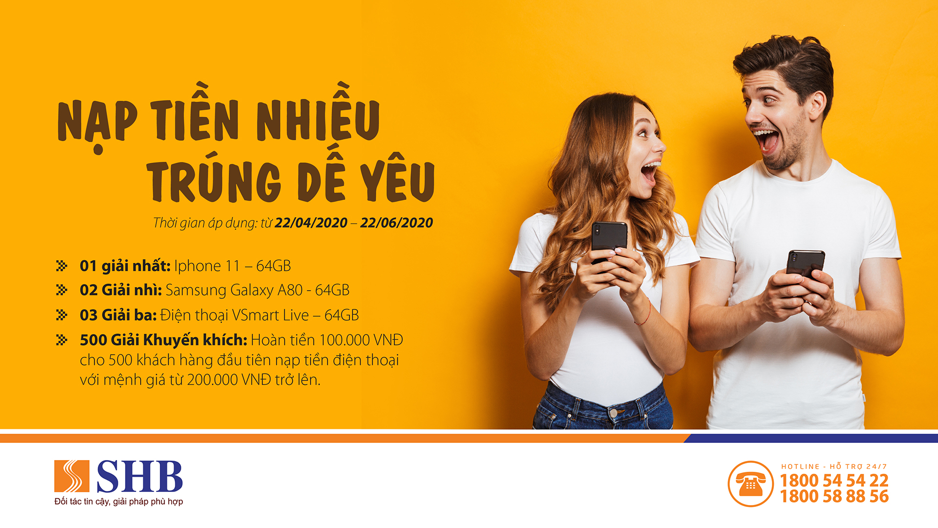 Từ ngày 22/04/2020 đến hết 22/06/2020, Ngân hàng Sài Gòn – Hà Nội (SHB) phối hợp với CTCP giải pháp thanh toán Việt Nam (VNPay) triển khai chương trình khuyến mại “Nạp tiền nhiều – Trúng dế yêu” dành cho các khách hàng cá nhân sử dụng dịch vụ Nạp tiền điện thoại trên SHB Online và SHB Mobile trên toàn quốc.